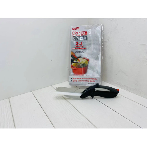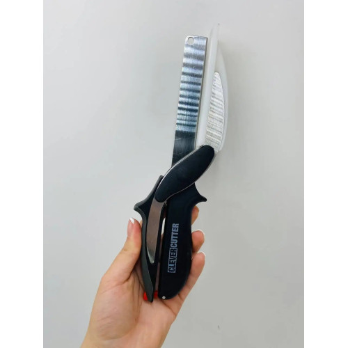 Розумний Ніж Ножиці 2 В 1, Кухонний Ніж З Якісної Нержавіючий Сталі З Імпровізованою Маленькою Обробною Дошкою. Дана модель працює на зразок ножиць, з однієї сторони ніж, з іншої вищезгадана обробна дошка. Він відмінно підійде для нарізки будь-яких продуктів, будь то овочі, фрукти, м'ясо та інше.