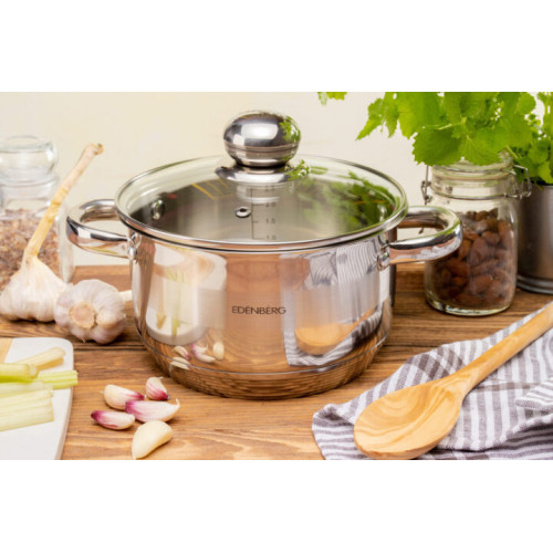 Каструля з кришкою Edenberg виготовлена з міцної нержавіючої сталі, виготовленої з урахуванням усіх вимог до якості. Каструля має п'ятишарове дно — воно забезпечить рівномірне прогрівання й довго зберігає високу температуру.