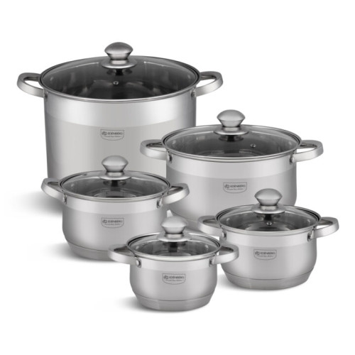Цей набір посуду містить п'ять каструль різного розміру. Для кожного виробу є кришка. Набір підходить для всіх типів плит.