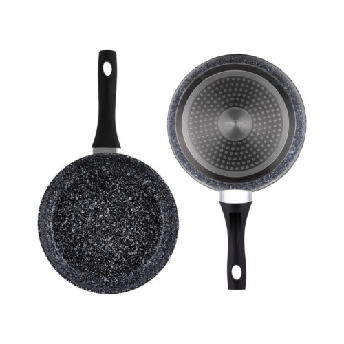 Виріб виготовлений із міцного матеріалу — алюмінію, який не впливає на смак їжі та не викликає алергію. Гранітне покриття допоможе легко очистити сковороду від залишків їжі, позаяк вони не прилипатимуть до стінок і дна. Посуд обладнаний зручною ергономічною ручкою. Сковорода підходить для всіх типів плит. Після експлуатації сковороду можна відправити в посудомийну машину.